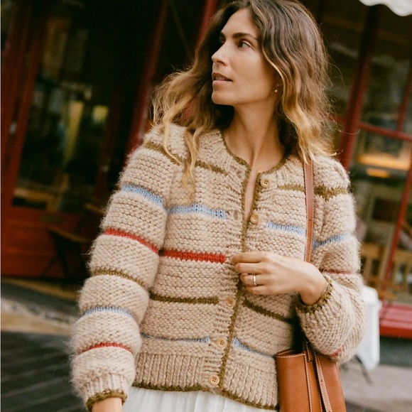 | Characteristics of goods | A 70s inspired color palette and stripe design, this beautiful button up cardigan has been handknit to ensure a chunky super soft feel. Our favorite knit of the season, the Leandra Cardigan in Kaleidoscope Stripe, crafted from 100% alpaca! Reverse jersey rows create a stripe texture and bubble shape along sleeve and body, while a pleat detail at sleeve reinforces the oversized and bubbled look of the style. | ||