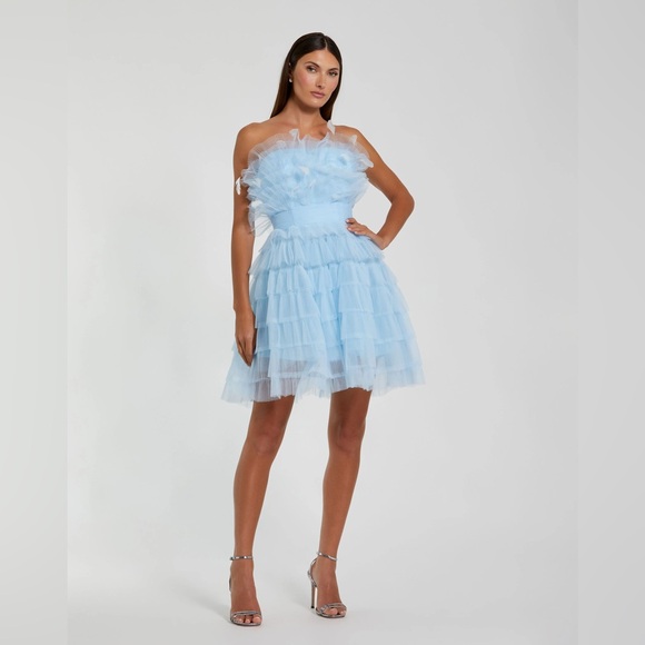 - Women > Dresses > NWT $798 MAC DUGGAL Blue Feathered Strapless Tulle Fit and Flare Dress BLUE MINI Strapless