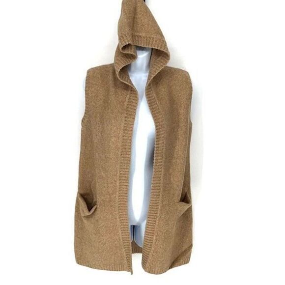 Tahari Womens Wool Blend Sleeveless Open Front Knit Hoodie Sweater Tan Small Sweaters