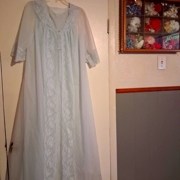 | Characteristics of goods | Perfect for a restful night's sleep.Pre-owned GUC SizeXLShoulder Armpits 20in Shoulder to hemline 54in Long sleeves.Pearl embellishments 2pc set. Tall girl friendly. Shadow Line Nightgown Set Experience comfort and elegance with this beautiful baby blue lace nightgown set. | ||