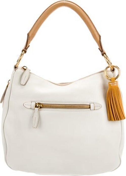Prada Hobo Neutrals Saffiano Lux Leather Colorblock Pattern Enameled Metal Triangle Gold-Tone Hardware Flat Handle Single Exterior Pocket Logo Jacquard Lining Zip Closure at Top Unfortunately, due to restrictions, this item may not be eligible for shipping in all areas. Satchels & Top Handle Bags